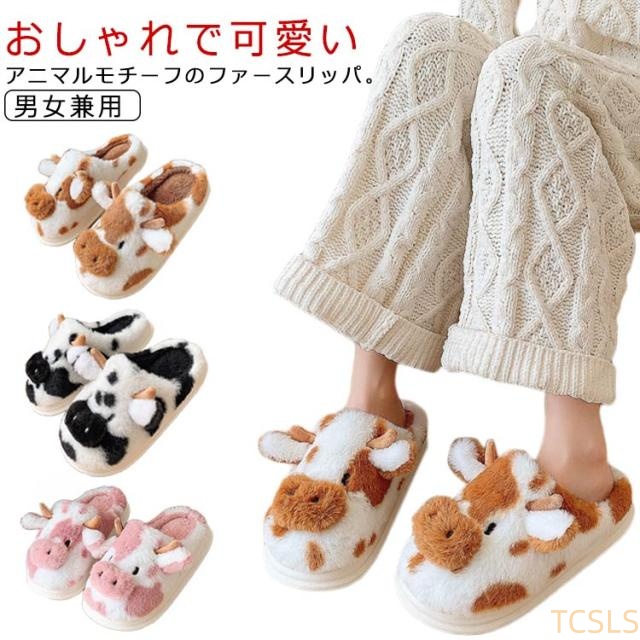 牛柄 スリッパ ファースリッパ カップル 可愛い 静音 滑り止め 室内用 もこもこ 室内履き 履きやすい ルームシューズ 冬用 あったか 防寒 男女兼用 事務所用 家庭用 送料無料