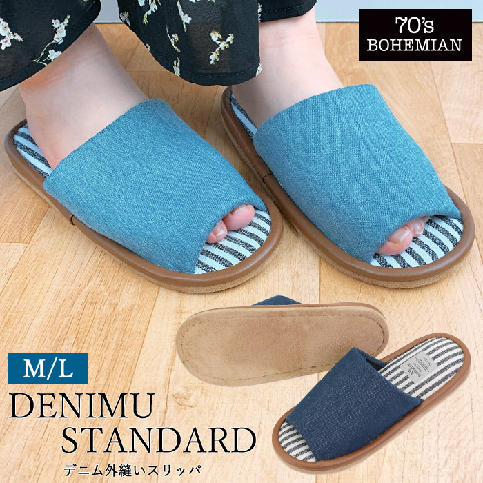 爽やかなデニムとストライプデザインのスタンダードスリッパ。 デニム独特の風合いを活かしたオールドスタイル。 パタパタと音がしにくい静音設計なのもポイント。 家での普段使いや来客用になど、様々な場面で活躍します。 ■サイズ M(約22.5〜26cm) L(約25〜28.5cm) ※表記サイズは全てメーカー記載のものとなります。詳細は画像をご確認下さい。 ■素材:表/ポリエステル・綿 中敷/ポリエステル・綿 サイド/ポリウレタン 底/ポリエステルスエード ■生産:中国 <商品画像について> ご覧になっているモニターや撮影環境の違いにより実際の商品と多少色味が異なって見える場合がございます。予めご了承下さいませ。