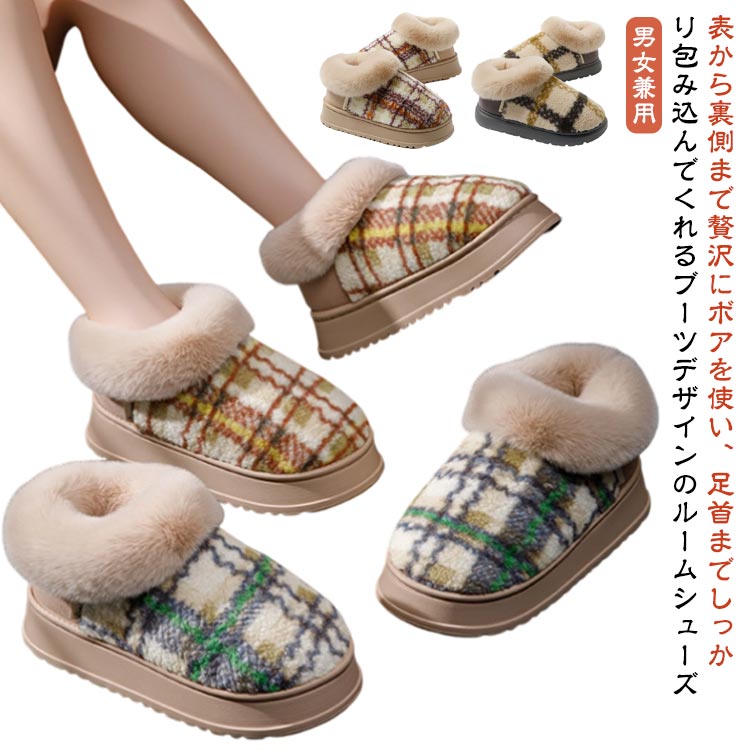 ■冬 ルームシューズ もこもこ ボア スリッパ 室内履き 暖か レディース メンズ ルームブーツ 厚底 軽量 防寒 洗える チェック柄 かわいい