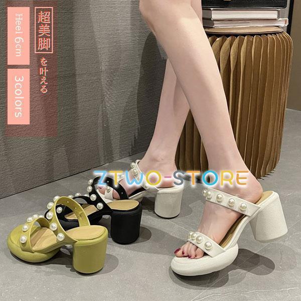ミュール サンダル レディース パール スリッパ 痛くない 歩きやすい 黒 白 春 夏 ヒールサンダル チャンキーヒール 美脚 シンプル 太めヒール