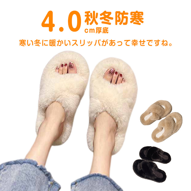 ■クロスサンダル 厚底 サンダル レディース ファーサンダル もこもこ スリッパ ファースリッパ 4cm 厚底 ルームシューズ 秋冬 ボア 来客用