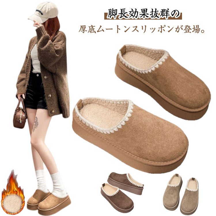 ■ブーツ シューズ ムートン ムートンスリッパ レディース 厚底スリッポン 4cmヒール ミニ丈 裏起毛 室外 スリッパ ボア ムートンスリッポ