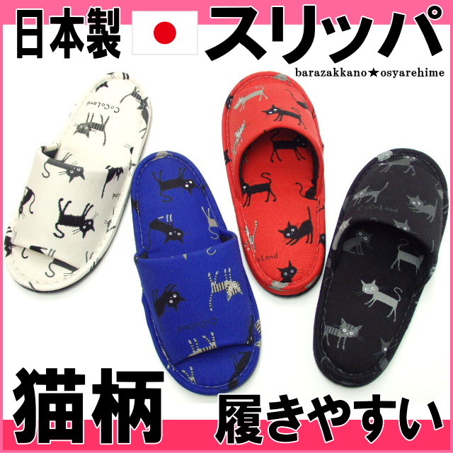 ■スリッパ 猫柄 前あきタイプ ネコプリント コットン ルームシューズ キャット 日本製 猫雑貨 猫グッズ かわいい おしゃれ ギフト プレゼ