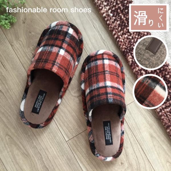 ■スリッパ おしゃれ ルームシューズ レディース 無地 チェック柄 ブラウン パタパタ音がしにくいスリッパ 滑り止め付き