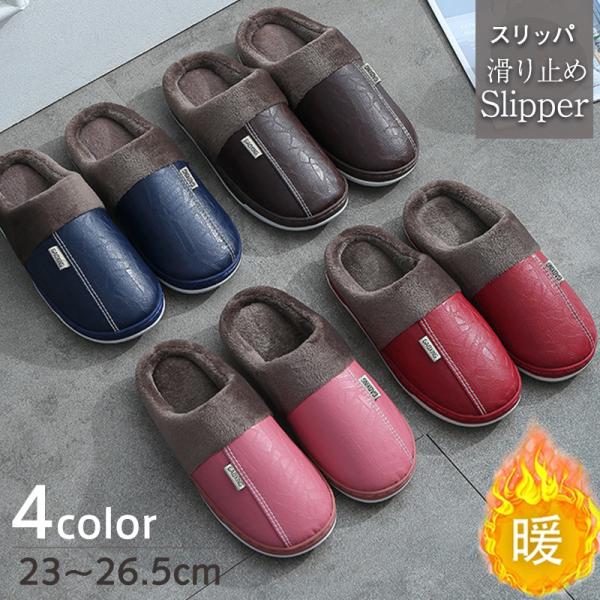■スリッパ レディース メンズ ルームシューズ PU レザー ぺたんこ 滑り止め 室内 室内履き 来客用 ふわふわ もこもこ 玄関 冷え対策 大人