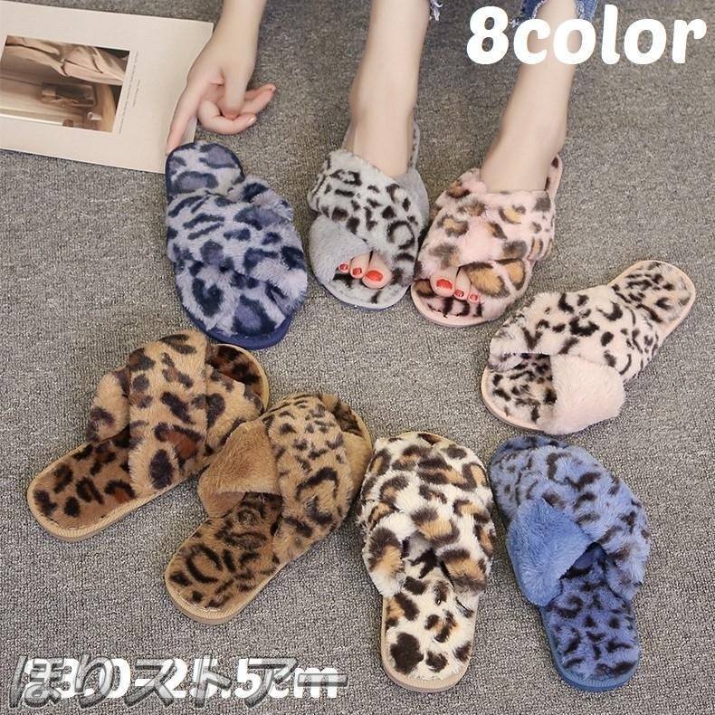 スリッパ ルームシューズ サンダル レディース オープントゥ フラット クロス フェイクファー ボア ヒョウ柄 レオパード柄 室内 ふわふわ もこもこ