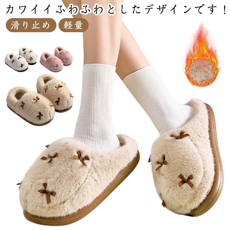 ■ルームシューズ リボン 部屋靴 軽量 履き心地 ふわふわ シンプル もこもこ レディース かかと付きスリッパ スリッパ かかとなしスリッパ