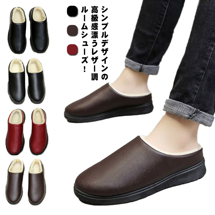 ■送料無料 レザー ルームシューズ ボア 冬 もこもこ あったか レディース メンズ 軽量 滑り止め スリッパ かわいい 室内 静音 冷え性 防災
