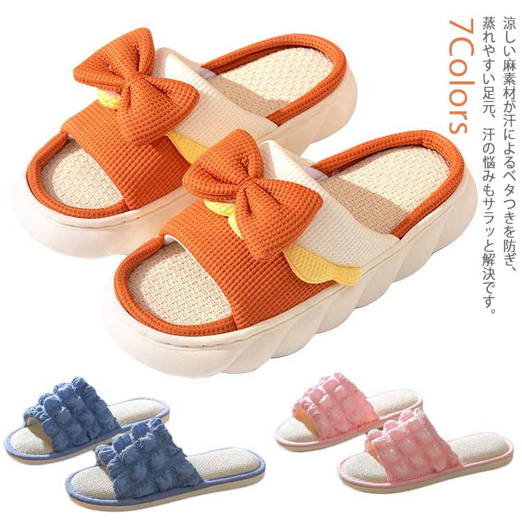 ■送料無料 ルームシューズ スリッパ 室内 無地 リボン レディース ホームスリッパ ギフト 夏 麻 サンダル 涼しい 春 可愛い リネン ジュー