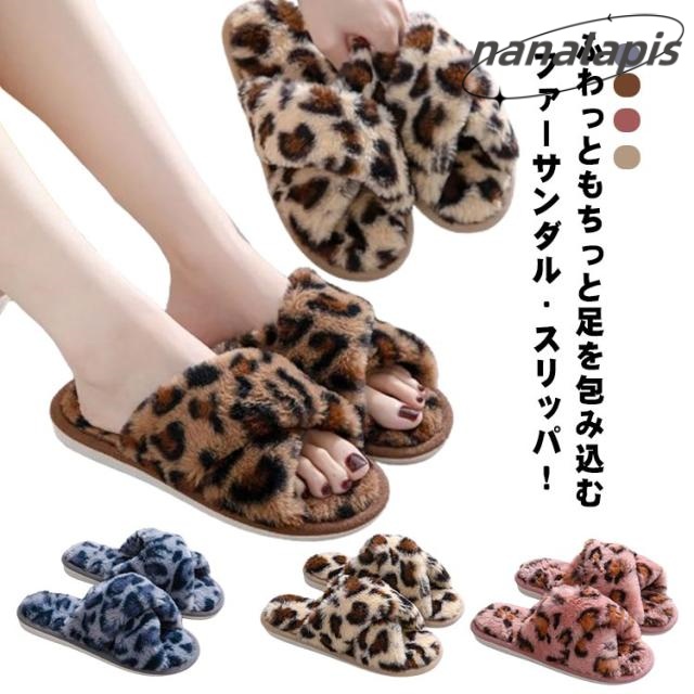 ファースリッパ ファーサンダル レディース 靴 ルームシューズ スリッパ フェイクファー もこもこ レオパード 柄 ヒョウ柄 かわいい 室内スリッパ 秋冬 シューズ 温かい モコモコ 滑り止め 室内履き 防寒 冬物 来客用 軽量 洗える