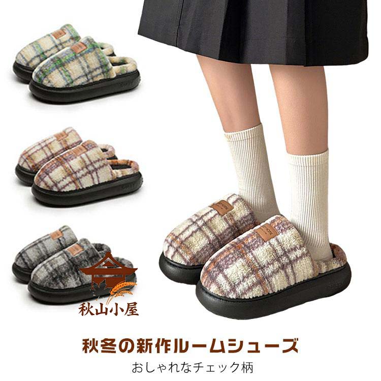 ルームシューズ レディース メンズ 秋 冬 チェック柄 厚底 軽量 スリッパ もこもこ あったか おしゃれ ルームスリッパ 室内履き 男女兼用 新生