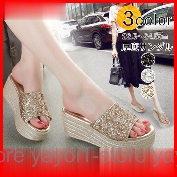 ■サンダル レディース 厚底 ウェッジヒール 8cm スリッパ ヒール ミュール キラキラ 夏 靴 室内 女性 婦人 美脚 脚長 コンフォート おしゃ