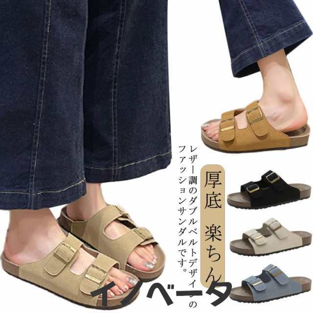 コンフォートサンダル レディース ぺたんこ ダブルベルトサンダル 厚底 フラットサンダル サンダル スリッパ ワンマイルシューズ 楽ちん 歩きやすい 大きいサイズ 幅広 甲高 履きやすい カジュアル ゴールドバックル