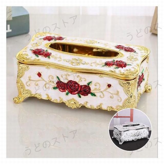 こちらは欧米風ティッシュケースです。高級感のあるデザインのティッシュボックスケースで鮮やかなバラのデザインにより、インテリアとしても映えます。【サイズ】横: 約22cm縦: 約12.5cm高さ: 約9cmボックスティッシュを箱ごと収納することができません。中身と取り出して収納していただくか、もしくはビニールに入ったティッシュをご使用くださいませ。