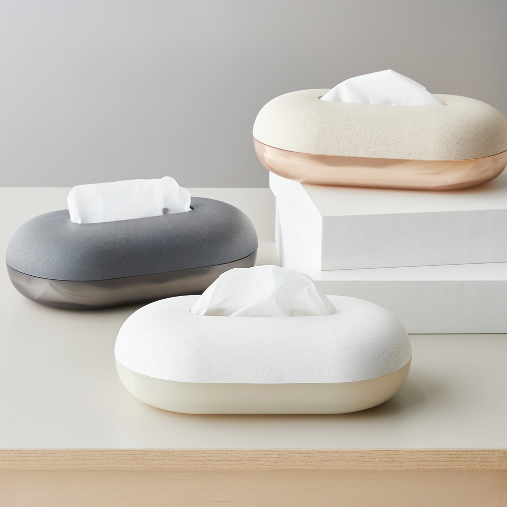 バイオプラスチック素材の「TEXa(テクサ)」はお米のもみ殻を多く含み、細かい粒子が見えることで、一見してプラスチックとは思えないようなマットな質感でやさしいニュアンスを表現しています。従来のプラスチックと比べて石油由来プラスチックの使用量を約35%以上削減透明部分は残量を一目で確認できます。角のないやさしい形状とコンパクトなサイズ感は置く場所を選びません。スリムなソフトパックティッシュにぴったりのケースです。濡れても問題ない素材なので、洗面所やキッチンでもお使いいただけます。角のないフォルムは空間をやさしく演出します。雰囲気のある素材感とお気に入りとして飾っておきたくなるようなデザインによって、愛着を持って長く大切に使っていただきたいという思いを込めたプロダクトです。