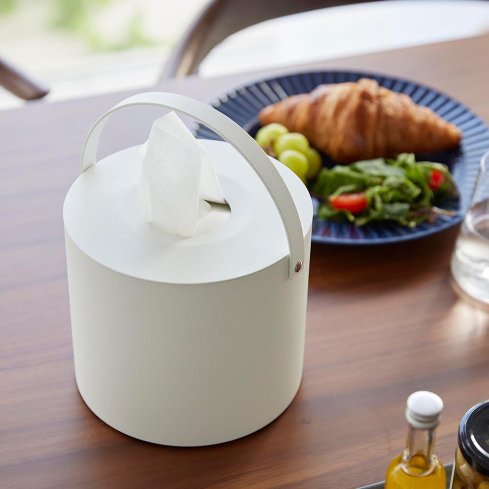 シンプルでスタイリッシュな丸型ティッシュケース。 高さを出してくれるパーツ付きで最後まで取り出しやすい。 ティッシュペーパーが多すぎる場合は調節してください。 蓋を開けて簡単に補充できます。