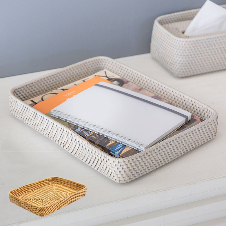 ■トレイ トレー Lサイズ ボックス ケース ラタン 籐 ホワイト ナチュラル 約 W 35cm D 26cm H 6cm アメニティトレイ カフェトレイ ファイ