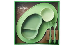 ブランド名の「 SUCSUC(スクスク)」は、そら豆をイメージした形で、お子様がすくすく育ってほしいという願いを込めました。バイオマスプラスチック素材を用いて、こどもにも地球にもやさしく、成長によりそうフードウェアブランドです。1〜3歳をターゲットにしており、トレイに食器をブロックのようにはめ込んで使うため、「ブロック遊び(知育)」と「お子様が食事中に食器をひっくり返してしまうことを防ぐ」という、2つの機能的要素を取り入れた商品です。SUCSUCギフトセット4pcs GRのセット内容は下記の通りです。・仕切りプレート×1点・ミニボウル×1点・トレイ×1点・カトラリーセット(スプーン&フォーク)×1点離乳食の中期・後期ぐらいから、まずはボウルが活躍します。自分で食べれるようになってきたら、トレイにセットするところ