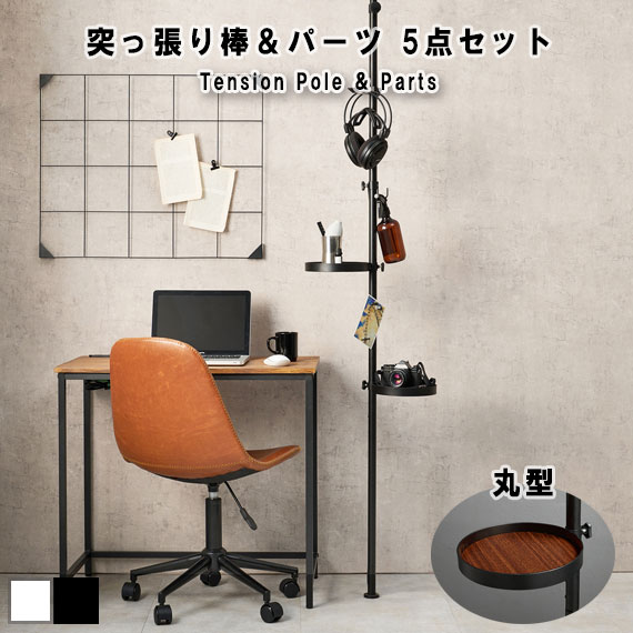 ■Tension Pole & Parts 突っ張り棒&パーツ 5点セット(丸型) (ラック 棚 トレイ 円形 フック スタイリッシュ 傘立て ハンガー シンプル