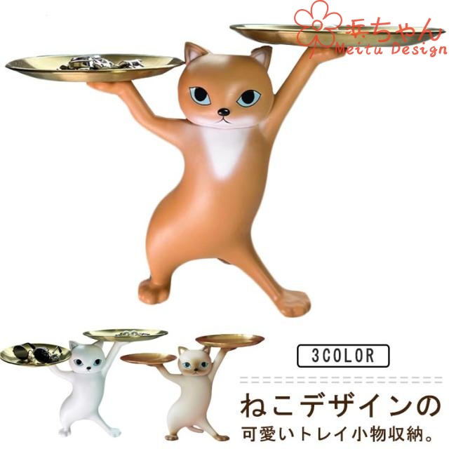 ■卓上 猫 置物 皿を捧げるねこ キー収納 トレイ 小物収納 玄関 猫 インテリア 置き物 樹脂 おしゃれ 動物 フィギュア 36×25cm 立体 可愛