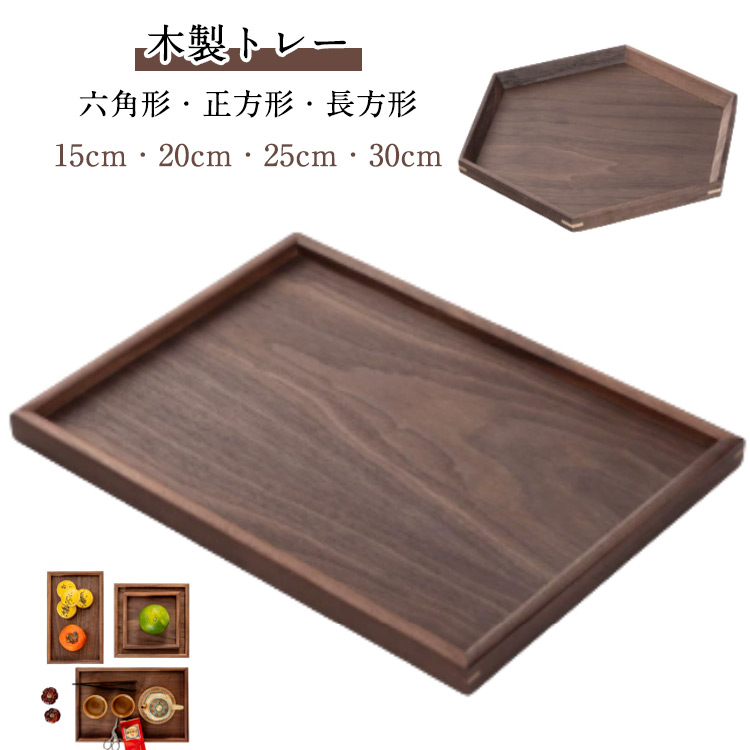 ■長角膳 トレー 高級感 カフェトレー くるみ 角型 木製 ウッドトレー 正方形 四角 羽反 天然木製 お盆 トレイ 膳プレート 六角形 文房具収