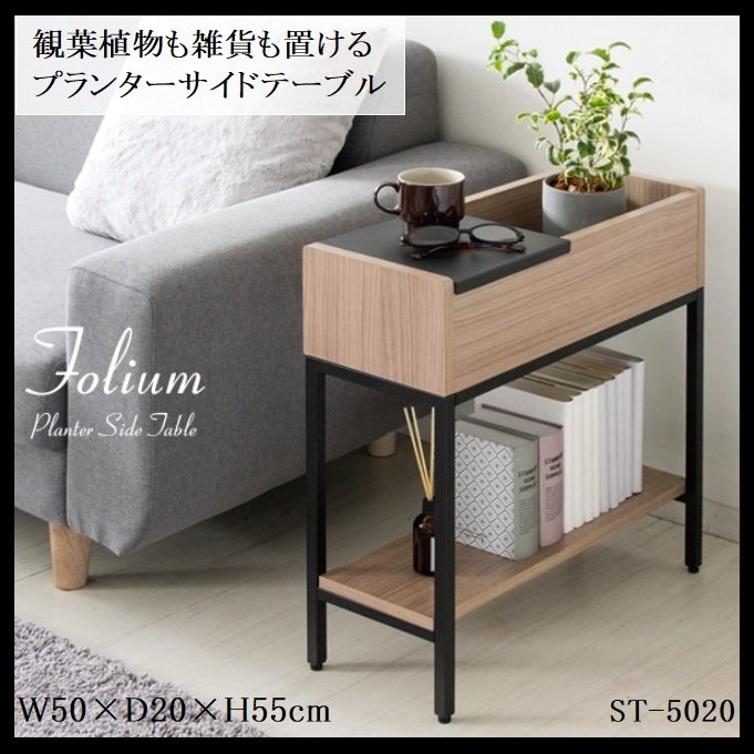 お気に入りの観葉植物を飾りながら飲み物や本が置けるプランターサイドテーブル『Folium(フォリウム)』。 テーブルに置くことで水やりもしやすく、ボックス状の棚は鉢が倒れず安心です。 飲み物やリモコンがサッと置けるトレイはお好きな位置にスライドしたり取り外しも可能です。 落ち着きのあるライトブラウンの木目柄と細めのブラックフレームはグリーンを引き立てます。 商品名 プランターサイドテーブル Folium(フォリウム) サイズ 幅50×奥行20×高さ55cm 材質 合成樹脂化粧パーティクルボード(PVC)、スチール(エポキシ樹脂粉体塗装) 備考 組立式(約20分) ※基本送料無料(沖縄県・北海道等の一部地域・離島等の条件によりましては別途送料が必要となります。)