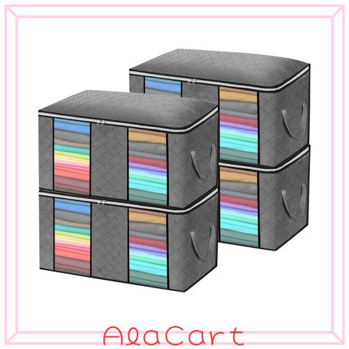 ■【90L 大容量 4 個組】透明双視窗 衣類・布団収納ケース 通気性不織布 大開口上部ファスナー 持ち手付き 押し入れ・寝室・床底収納用 グ