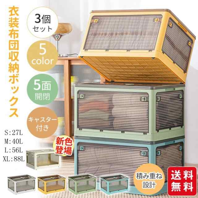 【2組10%OFF】収納ボックス 折りたたみ 5面開閉 3点セット 新生活 コンテナー おしゃれ 隠れキャスター付き 組立簡単 衣装布団 災害用 収納ケース 積み重ね 大容量 物入れ 移動便利 透明 ボックス コンパクト 家庭用 車用 S-L 27L 40L 56L