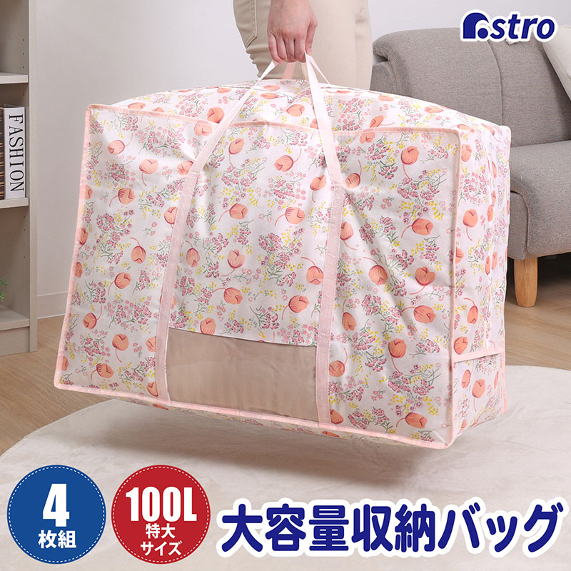 ■収納ケース 収納袋 収納バッグ チューリップ柄 不織布 引越し 4枚組 100L 布団 衣類 持ち手 透明窓 アストロ 168-04