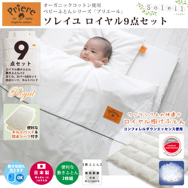 プリエール『ソレイユ』は、掛けふとんも敷きふとんも丸ごと洗濯機で洗え、カバーには、敏感な赤ちゃんの肌にやさしい無添加のオーガニックコットンを100%使用。赤ちゃんの快適な睡眠と、ママの負担を減らすために。機能性と利便性を両立させたおふとんセットです。 ■商品名 プリエール『ソレイユ ロイヤル』オーガニックコットンベビーふとん 9点セット ■セット内容 ・ロイヤル掛けふとん(コンフォレルダウンエッセンス使用) ・敷きふとん 2枚組(ハニカム&フリース) ・まくら ・オーガニックコットン掛けふとんカバー、フィットシーツ、まくらカバー ・キルトパッド ・防水シーツ ■製造国 日本製(防水シーツ・キルトパッドは中国製) ■お手入れ方法 ・ご家庭の洗濯機でお洗濯頂けます。 ■送料 送料無料になりますが、沖縄・離島のお客さまは別途追加料金が発生します。店舗からの注文確認メールをご確認ください。 ■発送まで こちらはメーカー直送商品となります。2〜5営業日以内に出荷いたします。