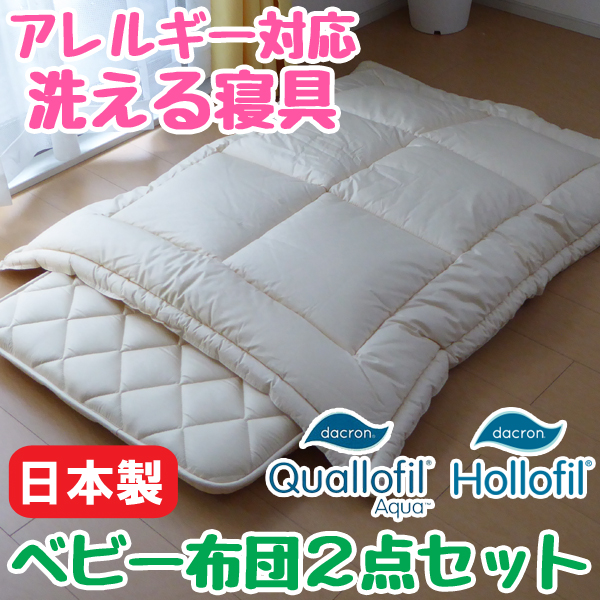【アレルギー対策ベビー組ふとん】ウォッシャブル ベビー組みふとんセット 軽量で洗える掛布団・敷布団がセットになったお昼寝ふとん ●ベビー洗える組み布団 ●国内メーカー/日本製 [掛けふとん] ●OK2015TO No.10 ●100×130cm ●側生地:綿100% ●詰め物:ポリエステル100%(ダクロンクォロフィルアクア) ●詰め物重量:0.7kg [固綿敷きふとん] ●OK2015TO No.14 ●70×120cm ●側生地:綿100% ●詰め物:巻きわた ポリエステル100%(ダクロンホロフィル) 芯わた(固わた)ポリエステル100% ●詰め物重量:1.8kg アレルギー対応、ホコリが出にくい組布団。清潔で快適な眠りのために開発された寝具用高機能中綿素材。 アレルギーを起こしにくい埃が出にくい高密度生地を側生地に使用。 ご友人や家族の出産祝いのプレゼントや入園祝いの贈り物・ギフトにオススメ!普段使いはもちろん、保育園やおひるね、お泊り用にも!