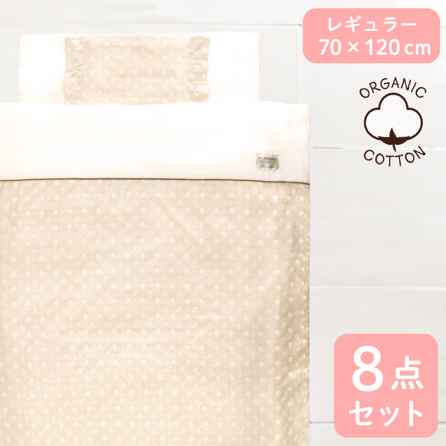 ■リーズナブル!ドット柄がかわいらしいオーガニックベビー布団セットです。 ■化学薬品不使用、無染色、無漂白で安心。赤ちゃんのお肌にやさしいオーガニックコットン。 ■ダブルガーゼ素材のふんわりした肌触りで、あかちゃんにもママにもやさしいベビーふとん8点セットです。 ■カバー類はもちろん、掛布団の中芯や敷布団もすべて洗えて清潔です。