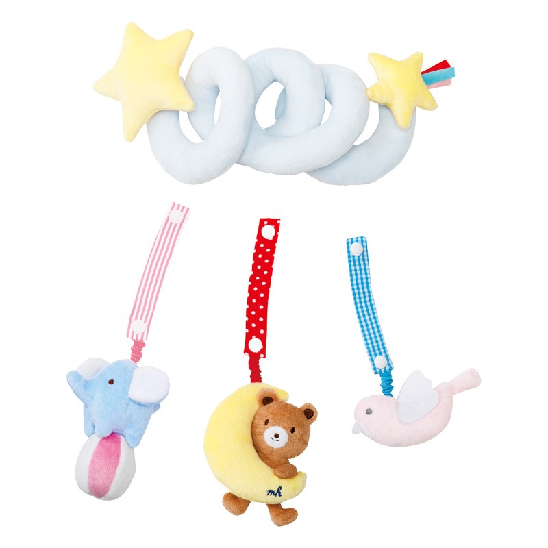 商品内容:本体(全長約240?o/最大約560?o)・ゾウ・クマ・鳥×各1箱サイズ:約360×300×60?o(入)商品材料:ポリエステル100%原産国:中国製箱などの形状:化粧箱ベビーカーやベッドに取り付けることができるソフトプレイジムです。どうぶつたちは取り外して、ガラガラとして遊んでいただけます。