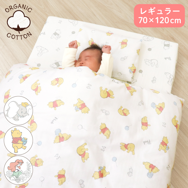 ディズニーのオーガニックベビー布団11点セット。 化学薬品不使用のオーガニックコットンダブルガーゼ生地を使用しています。 全て洗えます。 内寸法70×120cmのベビーベッドに合います。 当店ネット限定のDisney「ディズニープリンセス」「くまのプーさん」「ダンボ」デザインが出産祝いにも人気!