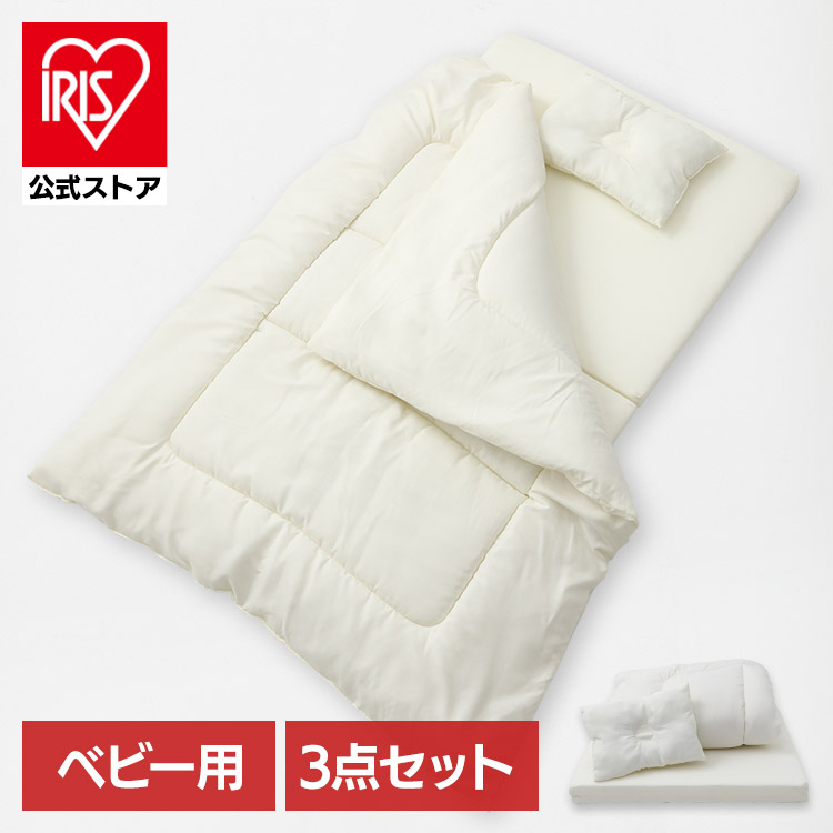 ベビー用の掛け布団・敷き布団・枕の3点セットです。届いて直ぐに使える便利な3点セット。●仕様[掛けふとん]約95×約120cm ポリエステル100%[敷きふとん]約70×約120cm ポリエステル100% 厚み4cm[枕]約35×約25cm ポリエステル100%●洗濯表示掛けふとん、枕:手洗い可敷きふとん:洗濯不可※当商品はお取り寄せ品の為、在庫の確認及び商品のお届けまでお時間を頂く場合がございます。また、商品がメーカーにて完売となっていた場合、キャンセル又は注文内容の変更をお願いいたしております。予めご了承くださいますようお願いいたします。