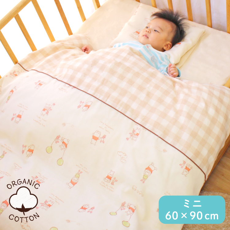 ディズニーPooh、Mickey・Minnieのオーガニックミニベビー布団10点セット。 化学薬品不使用のオーガニックコットンダブルガーゼ生地を使用しています。 日本製で全て洗えます。 ★サイズにご注意★ こちらは「ミニサイズ」です。 ベビーベッドをご使用される場合は、内寸法60×90cmのミニサイズ用です。