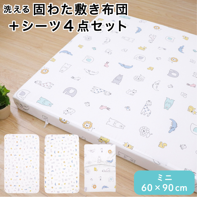 ■固綿敷布団4点セット ベビー ミニサイズ 60×90cm厚み5cm 北欧アニマル ホワイト 白 動物 二つ折り 洗える ベビーマットレス 敷きふとん