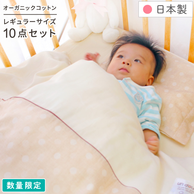 デザイン限定でお買い得! 化学薬品不使用のオーガニックコットンダブルガーゼベビー布団は9点セット。 日本製で全て洗えます。 内寸法70×120cmのベビーベッドにも合います。 出産祝いにも人気!