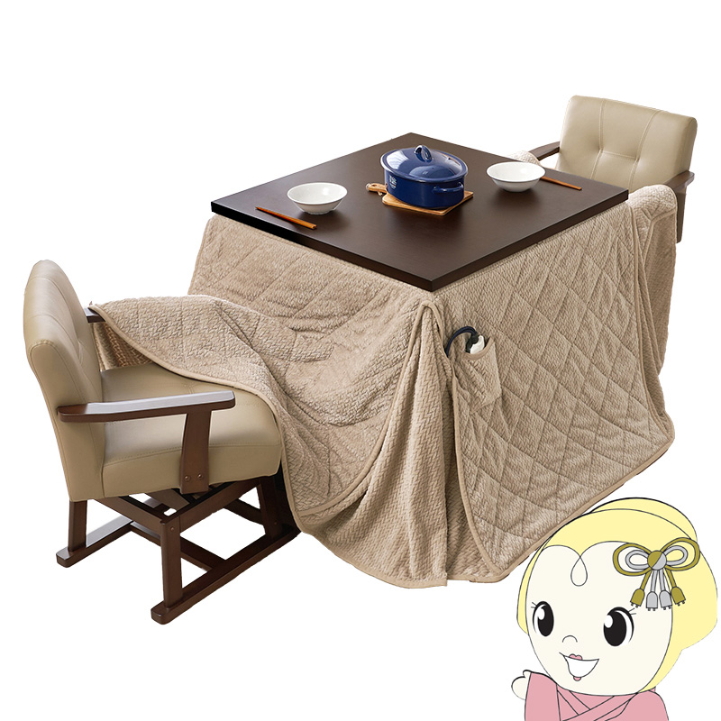 まとめて揃えられるダイニングこたつセット。テーブルの高さを6段階に変更できます ●こたつの高さを6段階に調節 ●製品仕様 生産地:こたつ:マレーシア製、布団:中国製、チェア:ベトナム製 サイズ:こたつ:(約)幅80×奥行80×高さ45/50/55/60/65/70cm、ふとん:(約)幅80×奥行80×高さ70cm、チェア:(約)幅56×奥行54×高さ73.5/68.5×座面高40.5/35.5cm 素材:こたつ:<天板>天然木化粧繊維板・UV塗装<脚部>ラバーウッド、ヒーター:MHU-601E(D) 600Wハロゲンヒーター(手元コントローラー付)、ふとん:< 側地><中材>ポリエステル100%、チェア:<木部>ラバーウッド<張地>合成皮革 補足説明:組立式、コード収納ボックス付、天板固定ネジ付、3段階継脚(高さ6段階調節可)、チェア:座面高5cm組替可能(スペーサー)、チェア:360°回転式 ※お客様組立て品につきましては、組み立て後に不良の連絡をされても対応ができません。組み立て前にパーツに不良・傷等がないか、必ずご確認下さいますようよろしくお願い申し上げます。 ※記載は商品