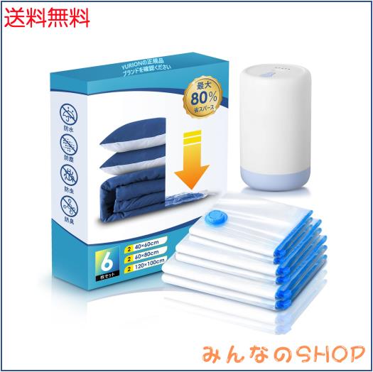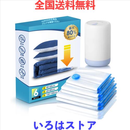 ■Yurion 布団圧縮袋 【6枚組/旅行に】 掃除機不要 衣類圧縮袋 コードレス電動ポンプ付き 120×100cm 2枚/60×80cm 2枚/40×60cm 2枚 真空
