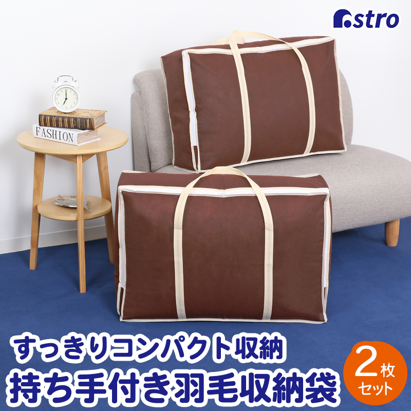 商品名:羽毛布団保管袋 持ち手付 ブラウン 2枚組サイズ:約幅66×奥行20×高さ47cmカラー:ブラウン内容:2枚材質:ポリプロピレン生産国:中国【収納目安(袋1枚あたり)】●シングルサイズの羽毛布団1枚【特長】●通気性の良い不織布でオフシーズンの羽毛布団をホコリから守り保管。●スリムな縦型でクローゼットや押入れの中などに立てて収納できる。●持ち手付きでクリーニングに出す際や引っ越しなどの際も持ち運びがしやすい。●ダブルスライダーでコの字にガバッと開くので羽毛布団の出し入れがスムーズ。【ご注意】●洗濯はできません。●強く引っ張ると破れるおそれがあります。