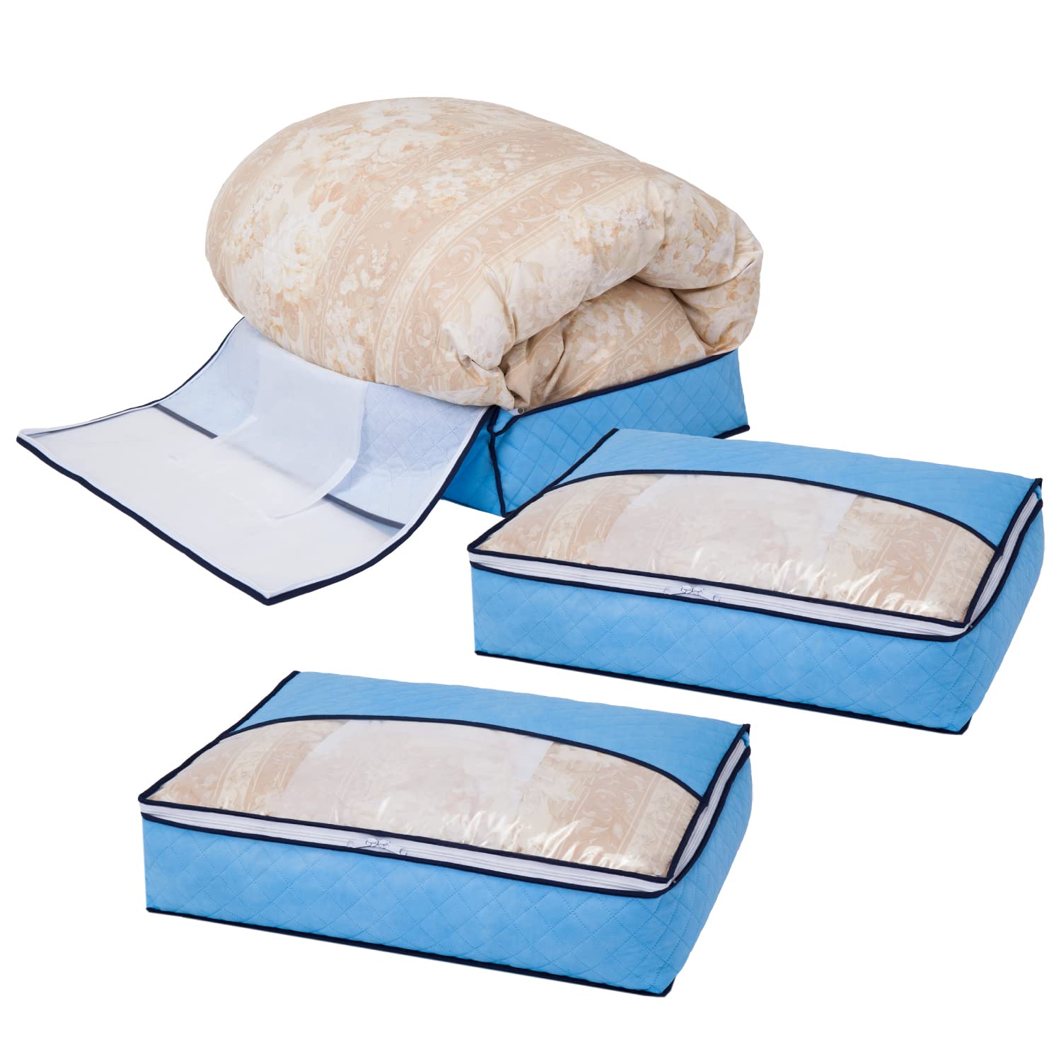 ■アストロ 収納ケース 羽毛布団用 シングルサイズ ブルー 3個組 除湿 吸湿 防ダニ 不織布 収納袋 薄型 スリム 収納ボックス コンパクト 透