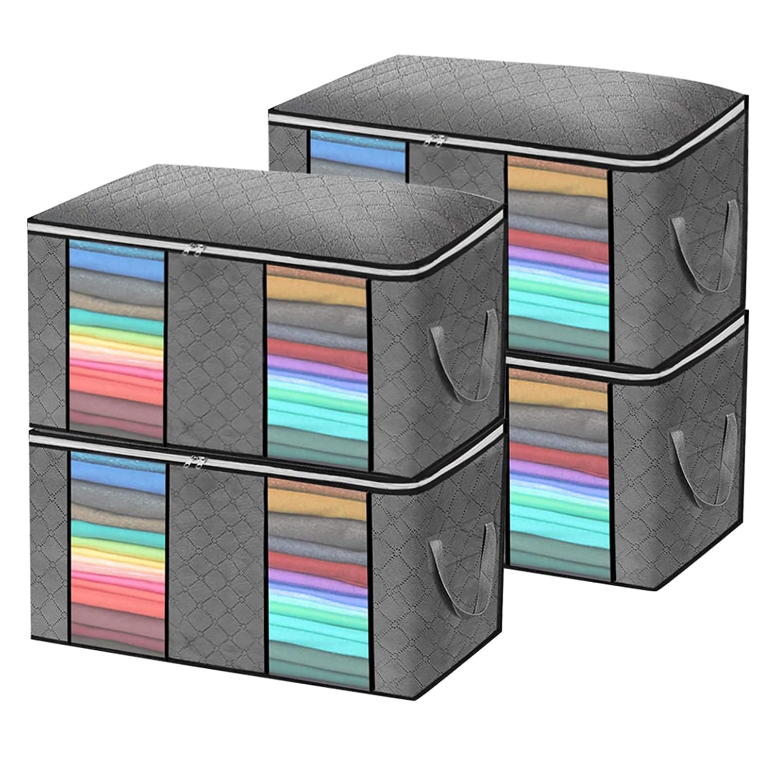 ■【90L 大容量 4 個組】透明双視窗 衣類・布団収納ケース 通気性不織布 大開口上部ファスナー 持ち手付き 押し入れ・寝室・床底収納用 グ
