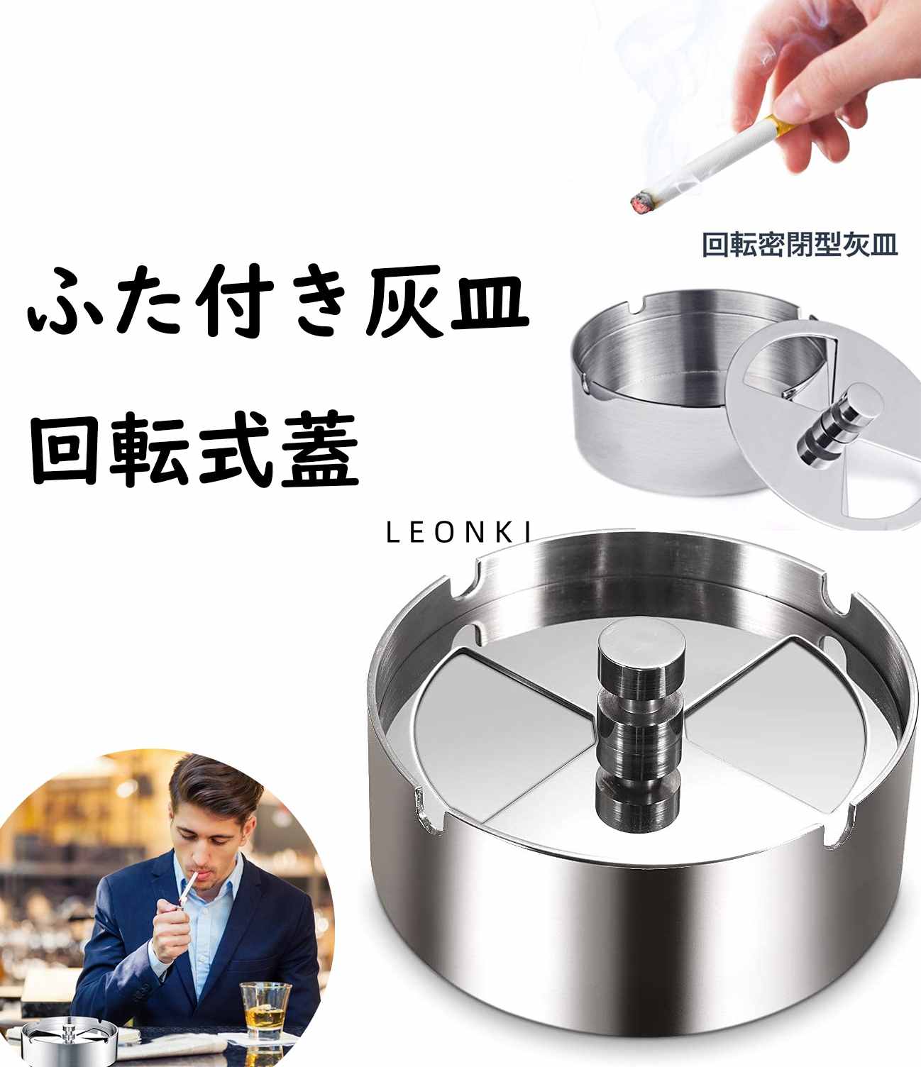 ■灰皿 ふた付き 大容量 ステンレス素材 卓上 屋外用 回転式蓋 密閉 密閉 卓上 客室 オフィス スタイリッシュ コンパクト 滑りにくい 煙と