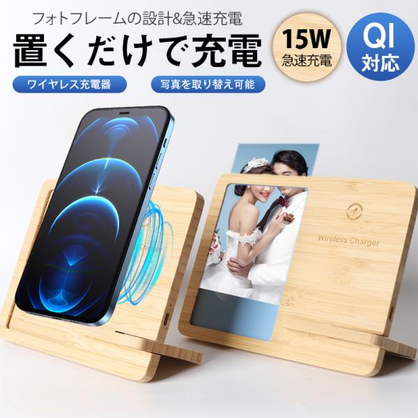 ワイヤレス充電器 木製 フォトフレーム 15w 竹製 i Phone Andriod 置くだけ 充電スタンド 充電器 ワイヤレスチャージャー Qi 急速
