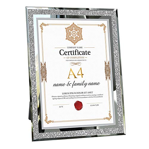 A: ガラス製でフレームはシルバーの縁がとてもオシャレ。ラメグリッターガラスの重なりがキラキラ輝き、写真をより一層華やかに見せてくれます。 B:卒業証書や賞状や表彰状、感謝状や許可証、ポスター、絵画、アートフォト、アートフレーム、フォトフレームなどをインテリアとしてお部屋に飾り、癒やしの空間を演出します。 C: 本体サイズ 外径: (約) 24*33.9cm 内径A4サイズ(約):21*29.7cm 本体重量:約700g/枚 枚数:1枚 材質:ガラス, D: 後ろは1枚の扉になっています。背面にスタンド付き※裏板のストッパーはネジきで4ケ所 ※壁掛け用フックや紐などは付属しておりません。 E: ギフト&プレゼントとしておすすめです:誕生日祝い/新築祝い、還暦祝い、開店祝い/お中元/お歳暮/お祝い/贈答/誕生祝い/出産祝い/インテリア雑貨/会社/昇進祝い/