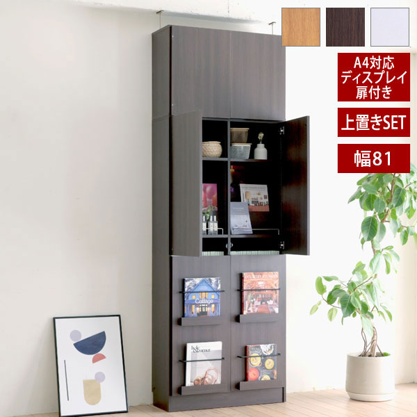 ■突っ張り 本棚 扉付きディスプレイラック 幅81cm A4対応 1cmピッチ MEMORIA メモリア 可動棚 飾り棚付き 大容量 マガジンラック コミック
