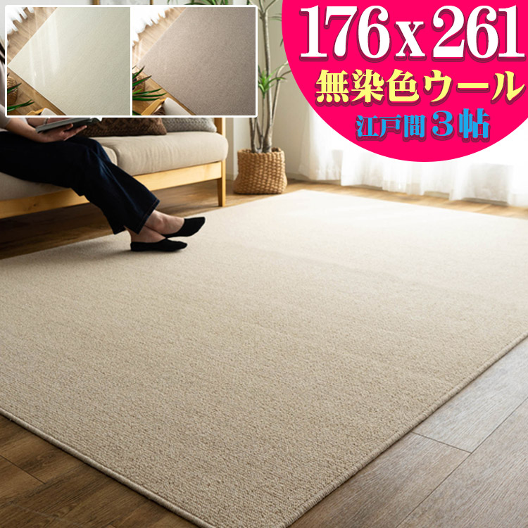 ■カーペット 江戸間 3畳 ウール 100% 176×261cm 防炎 抗菌 防臭 ラグ 日本製 ラグマット 無地 シンプル フリーカット ベージュ アイボリ