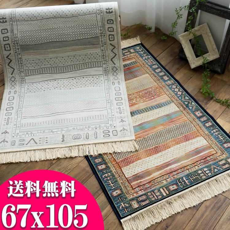 ■おしゃれ な1枚! ギャベ ギャッベ 柄 玄関マット シルクのような光沢! 67x105cm ベルギー絨毯 風水 ブルー ベージュ 玄関 マット 室内
