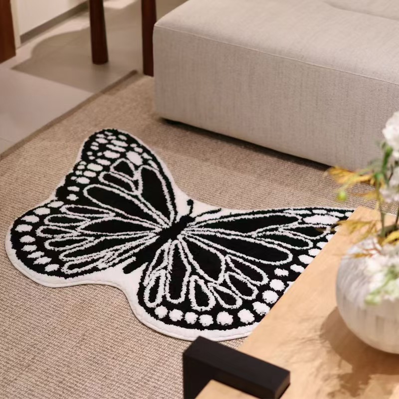 ラグ カーペット ラグマット おしゃれ 洗える 絨毯 マット ラグカーペット 蝶 北欧風 チェアマット 100x70cm ベビーマットレス デスクマット 玄関マット 遊びマット 室内 大判 マットレスラグ カーペット ラグマット おしゃれ ブラックxホワイト ブルーxレット